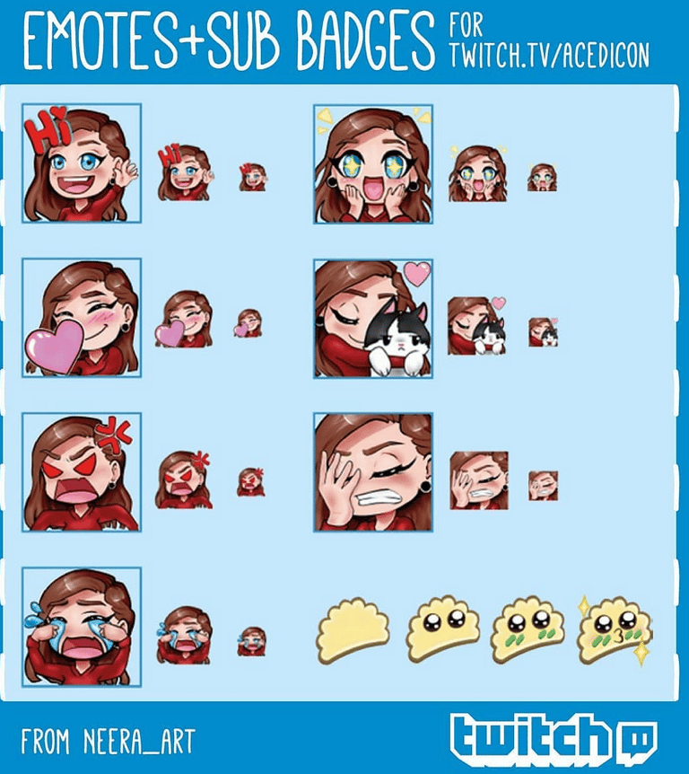 Du bekommst handgezeichnete Emotes in allen nötigen Größen für Twitch (112px / 56px / 28px) als PNG mit transparentem Hintergrund.