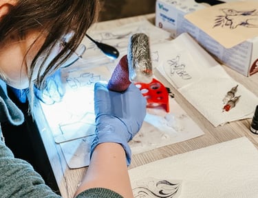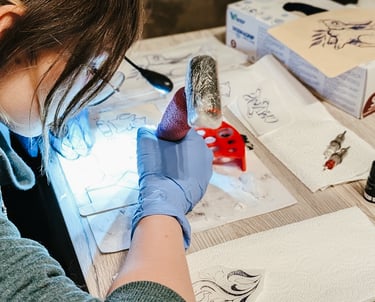 Stencil auftragen: Dein Design wird als Stencil auf die Haut übertragen, damit du sehen kannst, wie es aussieht.